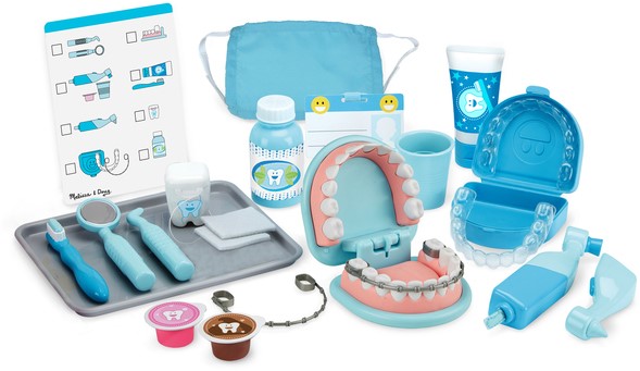 Met deze uitgebreide tandarts speelset van Melissa & Doug veranderen kinderen in zorgzame tandartsen die vol vertrouwen aan de slag gaan met poetsen, controleren, behandelen én uitleggen. De set zit boordevol realistische accessoires, van een extra groot speelgoedgebit tot een trilhandstuk, beugels, stickers voor 'gaatjes' en zelfs een mondkapje.