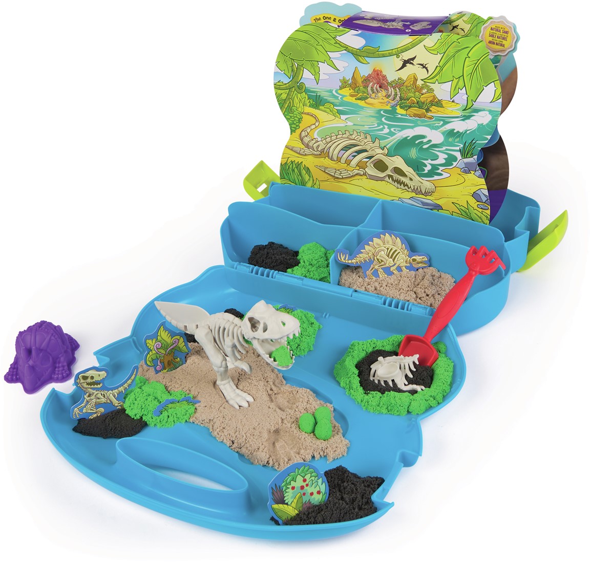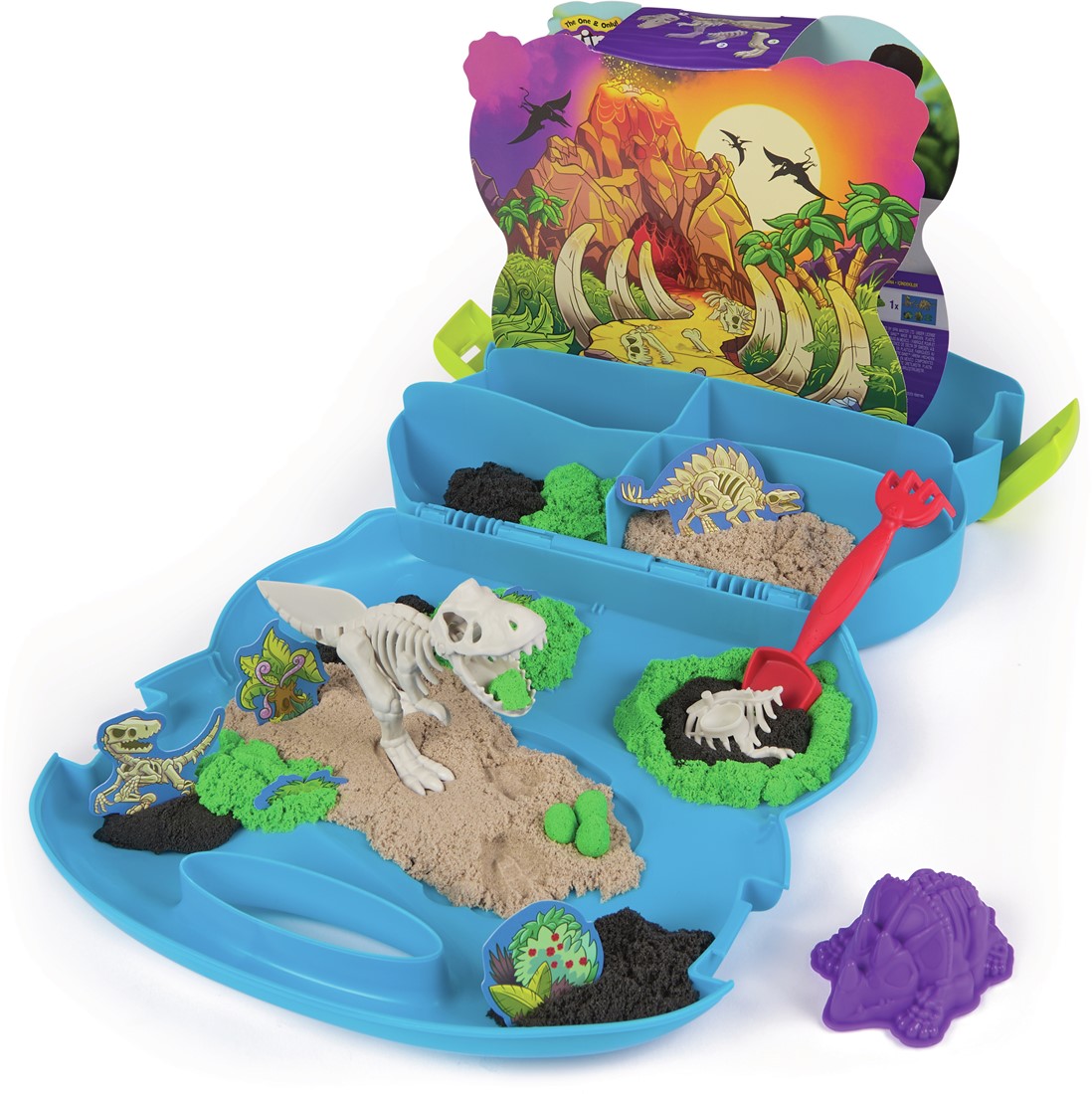 Inhoud: 680 g Kinetic Sand (3 kleuren), 1 vorm, 1 schep, 5 fossielen, 1 dubbelzijdige achtergrond, 6 decoratieve figuren