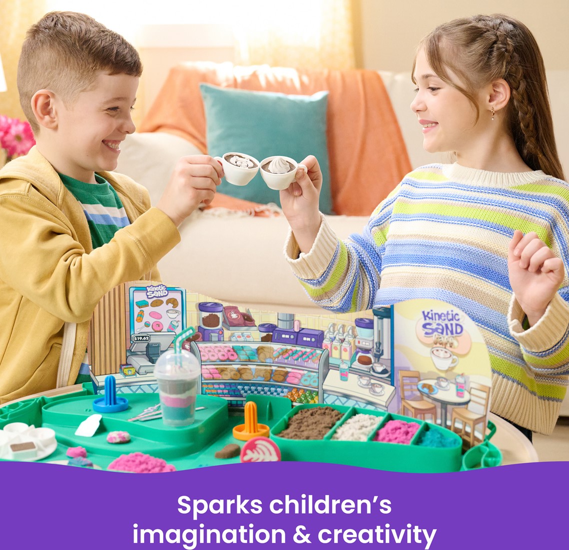 Word een echte barista met de Kinetic Sand-cafékoffer. Deze speelset prikkelt de fantasie en creativiteit als kinderen hun eigen cafécreaties boetseren, vormen en kneden. Met 793 g Kinetic Sand in 4 levendige kleuren (wit, bruin, groenblauw en glanzend roze), 2 cappuccinokopjes, een frappékopje, uitdrukbare decoratieve rietjes en meer, zijn er zoveel manieren om te spelen. Laat zand in een cappuccinokopje stromen en top het af met gegoten slagroom of een latte art-stempel. Doe een laag zand in het frappekopje en top het af met geraspte hageltjes. Kneed mini-croissants, donuts en andere vormen en maak ze steeds opnieuw. De Cafékoffer houdt het zand vast en kan na het spelen worden afgesloten voor eenvoudig opbergen. Kinetic Sand helpt bij de ontwikkeling van de fijnmotorische en zintuiglijke vaardigheden, is geschikt voor individueel of groepsspel en stimuleert sociale interactie. De Sandy-boerderijset is een must-have cadeau voor verjaardagen, kerst of andere gelegenheden. Het is een aantrekkelijk alternatief voor knutselklei en bouwspeelgoed. Het One and Only Kinetic Sand is gemaakt van natuurlijk zand, droogt nooit uit en blijft aan zichzelf plakken zodat het eenvoudig op te ruimen is. Voel het zand in je handen met extra kleuren van Kinetic Sand en ontdek nog meer speelsets (elk afzonderlijk verkocht).