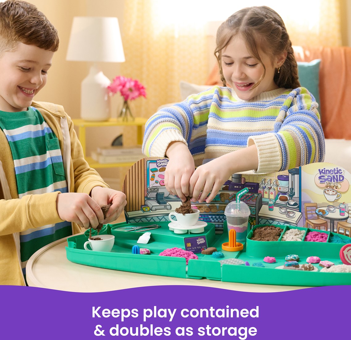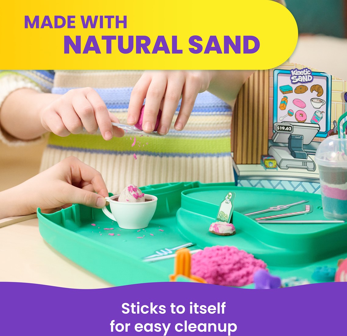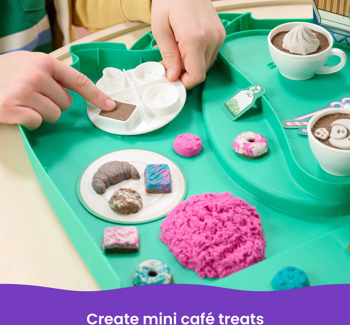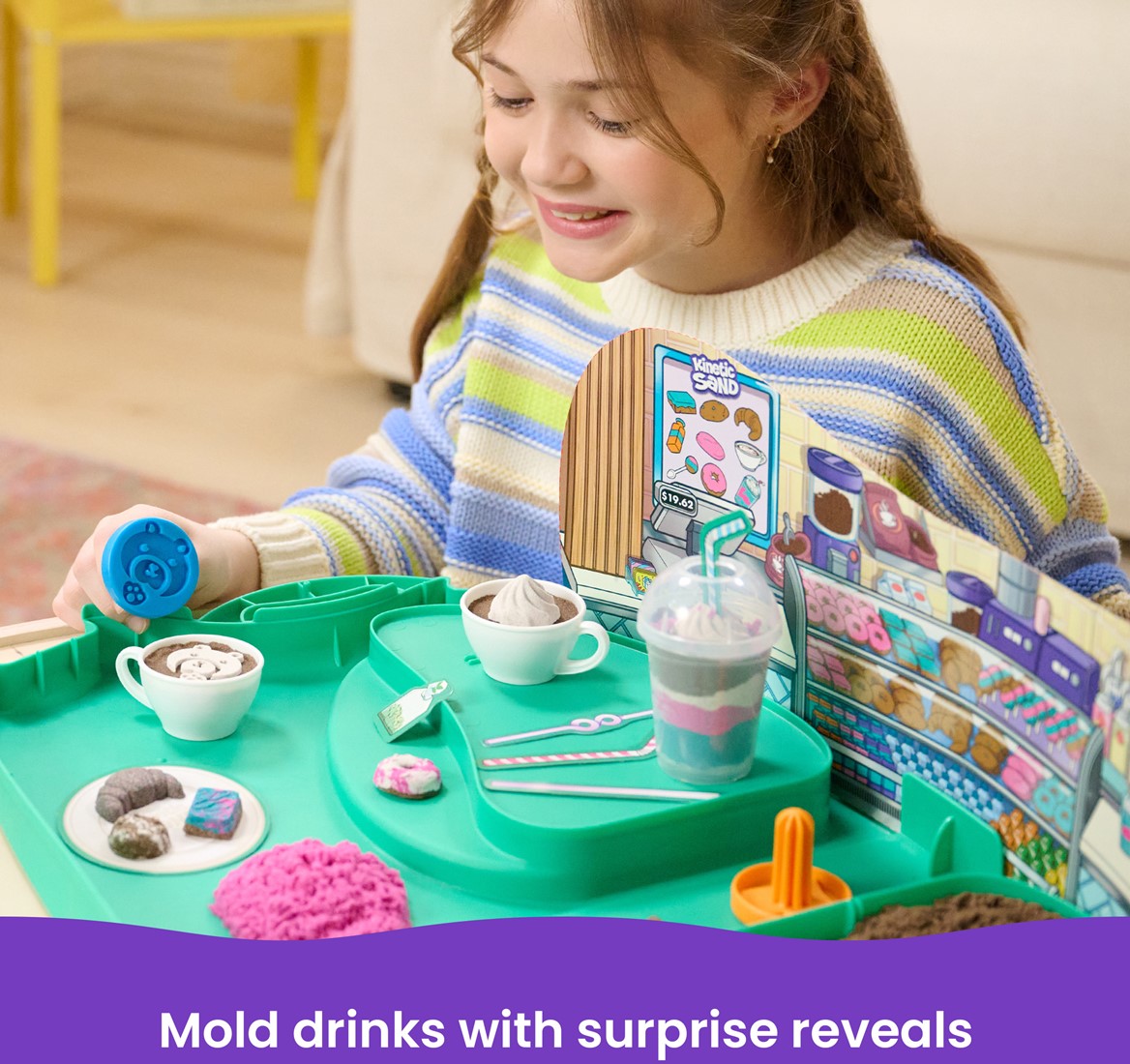 Inhoud: 793 g Kinetic Sand, 1 koffer, 2 cappuccinokopjes, 1 frappékopje, 1 schotel, 1 raspmes, 1 lollystokje, 3 latte-stempels, 1 decoratieve achtergrond, 12 decoratieve uitdrukstukken, 1 gebruiksaanwijzing