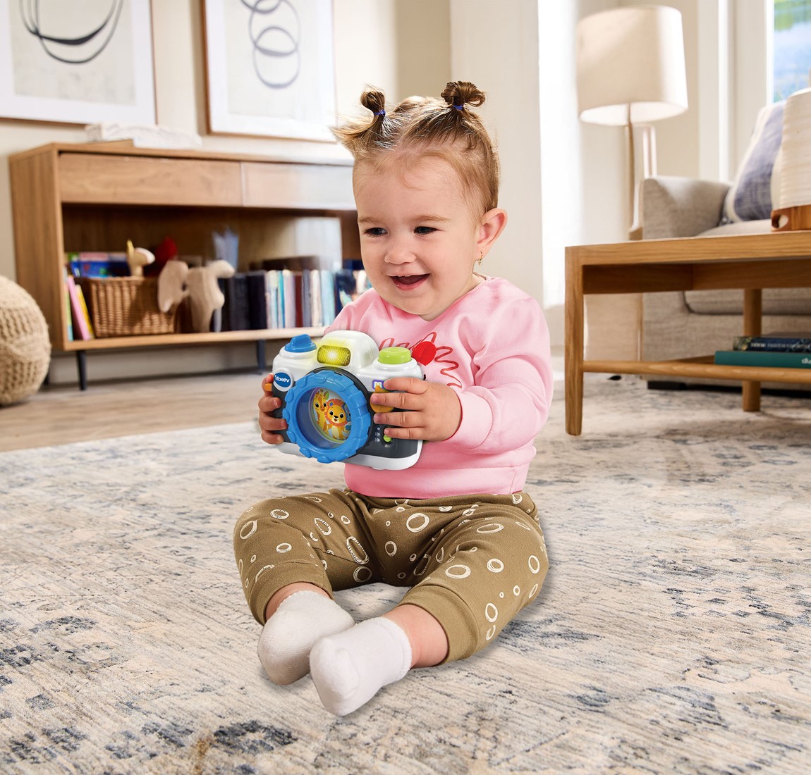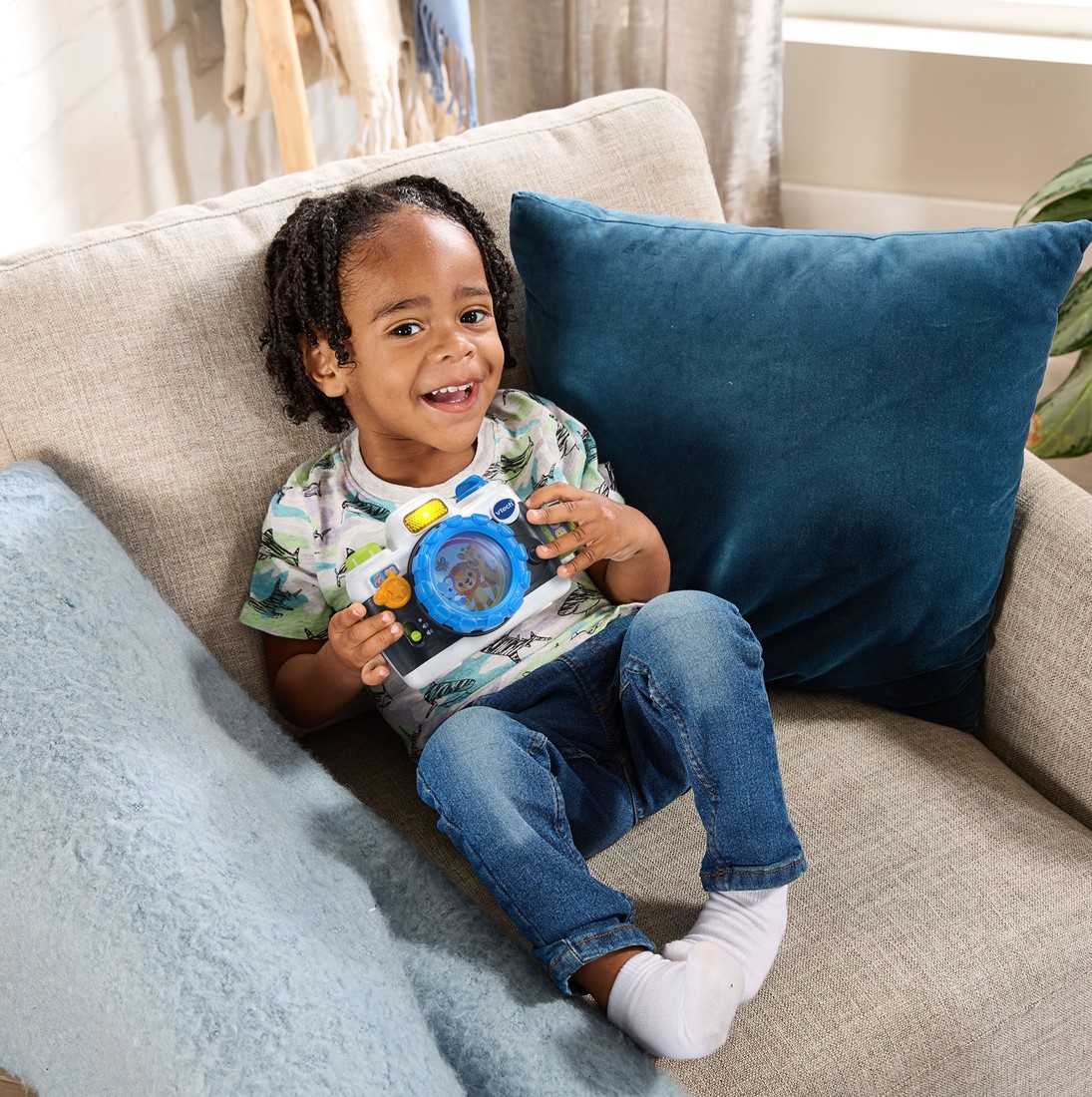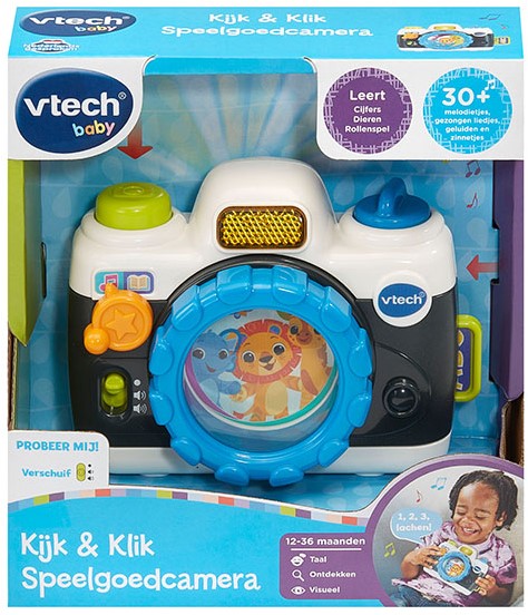 Tijd voor een foto! Ben je klaar? Lachen maar! De vrolijke reacties, verschillende toetsen en beweegbare onderdelen van deze speelgoedcamera prikkelen de fantasie en moedigen aan tot het spelen van rollenspellen. Kleintjes maken o.a. kennis met dieren en tellen tijdens twee speelstanden. Draai de lens om vrolijk gezongen liedjes te horen en de dieren te ontdekken of druk op de sluitertoets om te doen alsof je een foto maakt en luister naar de vrolijke reacties. 1, 2, 3, lachen!