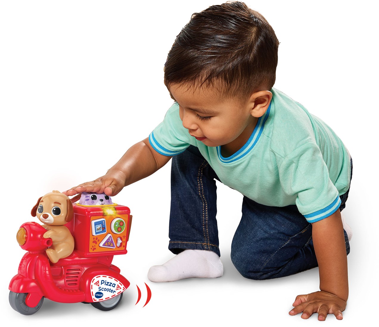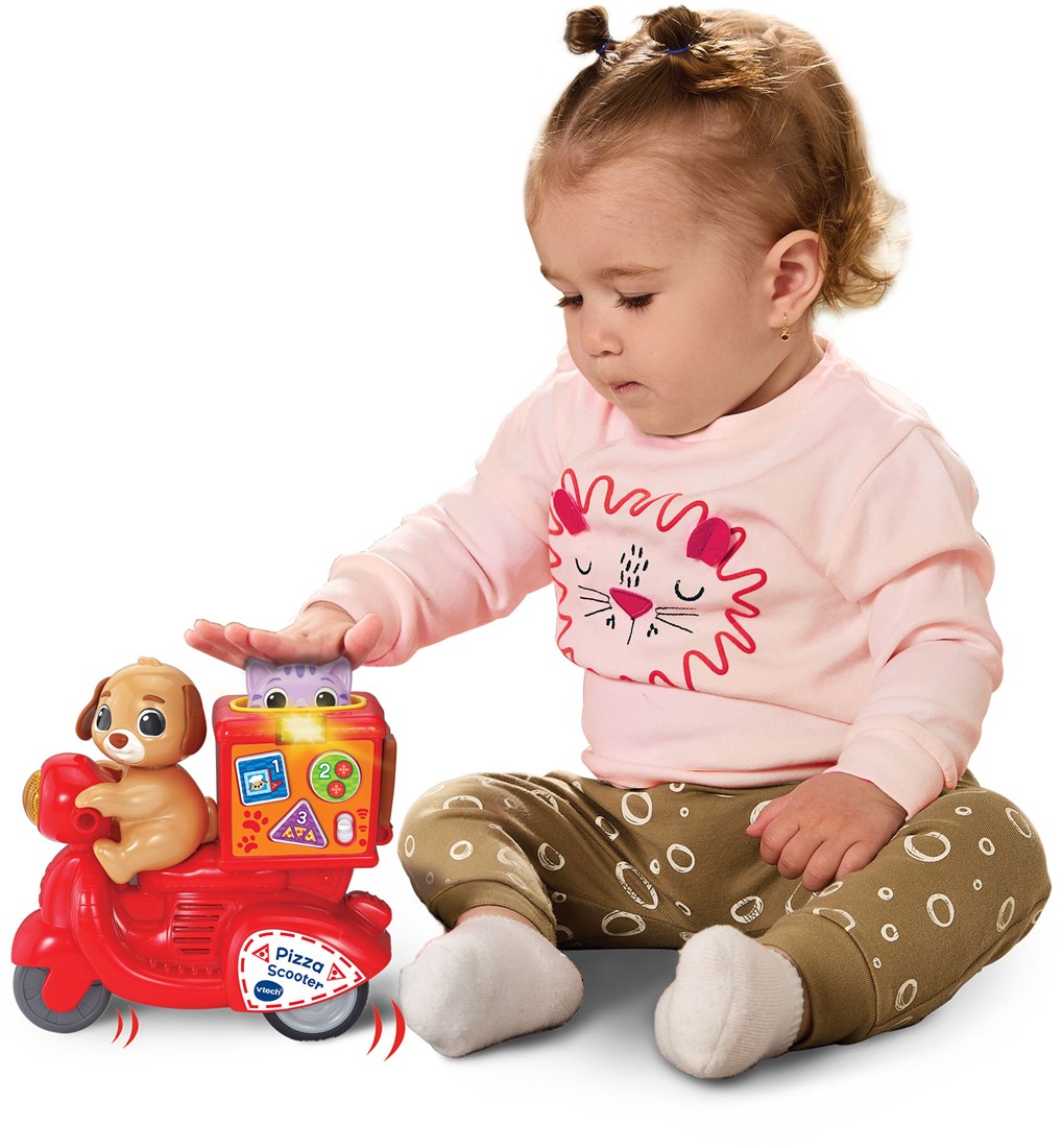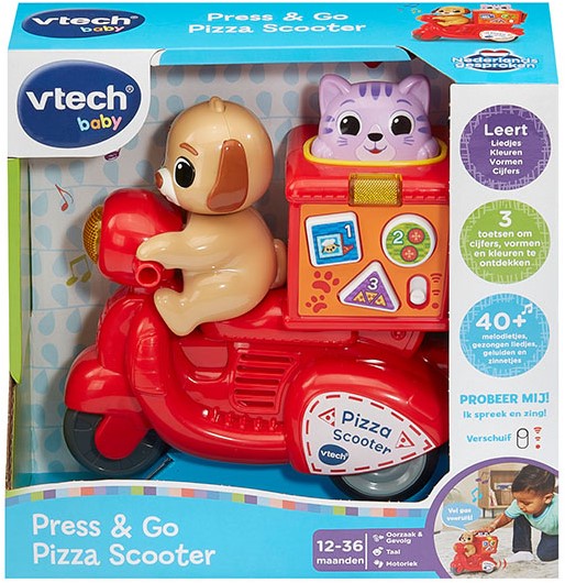 Wie heeft er speelplezier besteld? Deze pizzascooter bezorgt urenlang speelplezier, én pizza's! Druk op de kat om de scooter te laten rijden en druk op de interactieve toetsen om cijfers, vormen, kleuren en meer te ontdekken! Druk en rijd, het is pizzatijd!