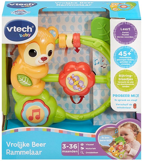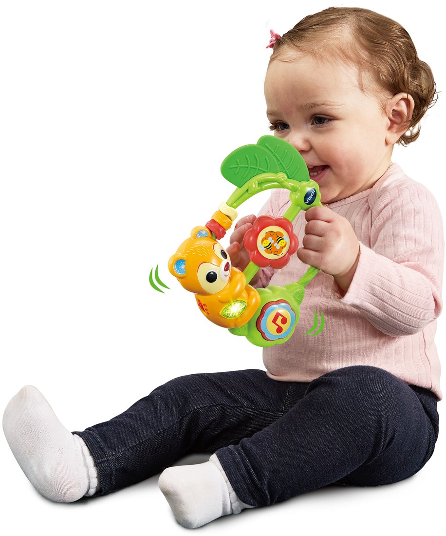 Beleef volop schud- en speelplezier met de beer rammelaar! Draai de bloem, druk op de muziektoets of op de knipperende blad-toets om verschillende geluiden, zinnetjes, liedjes en melodietjes te horen. De bijtring-blaadjes verlichten de pijn bij doorkomende tandjes en het formaat van de ring zorgt ervoor dat kleintjes het speelgoed goed kunnen vastgrijpen. Tijd om te schudden, spelen en zingen!
