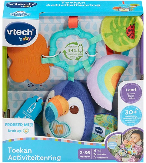 De toekan die overal mee naartoe kan! Hang deze vrolijke toekan aan de kinderwagen of laat je kleintje de verschillende texturen, vrolijke melodietjes en gezongen liedjes ontdekken tijdens het spelen! Maak kennis met kleuren, dieren en muziek terwijl de bijtring de pijn verlicht bij doorkomende tandjes. Onderweg zijn was nog nooit zo leuk!