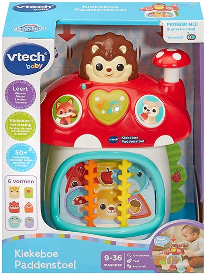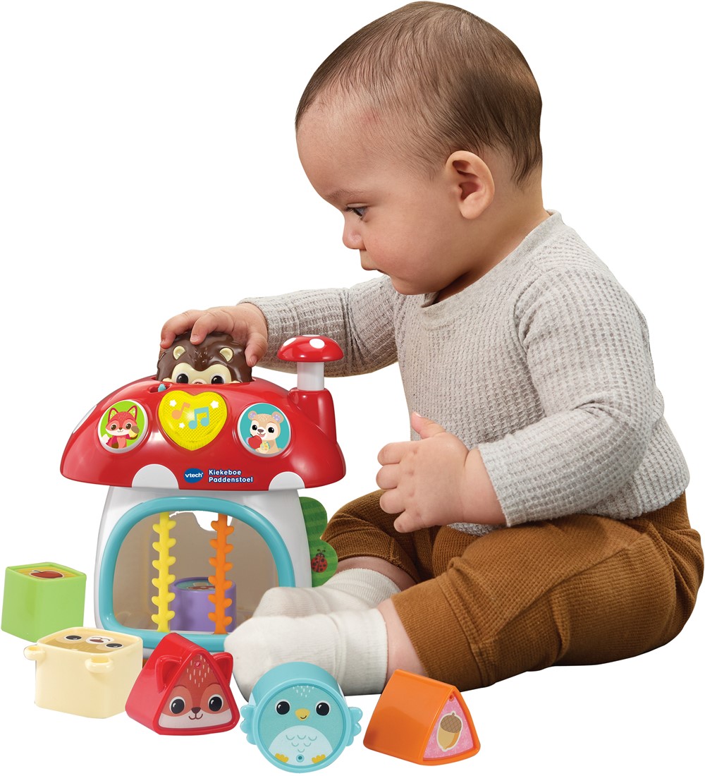 Speel kiekeboe met het egeltje in haar schattige paddenstoelenhuisje! Verstop het egeltje door erop te drukken en druk op de paddenstoel voor een kiekeboe-effect. Druk op de vos, beer en knipperende muziektoets om kennis te maken met vormen, kleuren, dieren en muziek. Plaats de 6 vormblokjes in het huisje door de elastische bandjes te bewegen. Kiekeboe, laten we verstoppertje spelen!