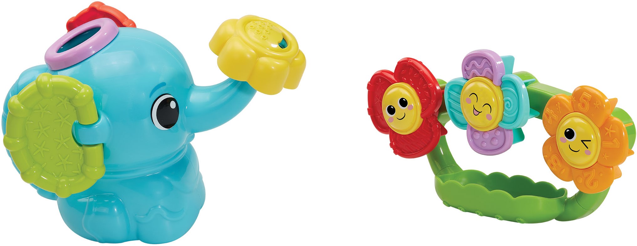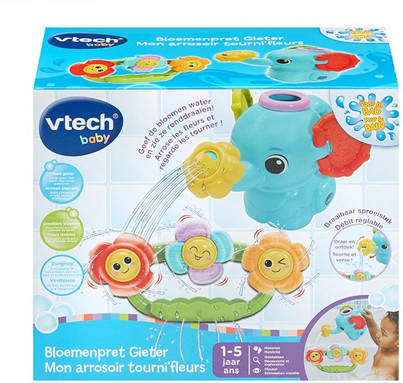 Spetter spater, geef de bloemen water! Vul de schattige olifantengieter met water en kantel de gieter om de kleurrijke bloemen water te geven en zie ze vrolijk ronddraaien! De zuignap aan de achterzijde van de bloemen is eenvoudig te bevestigen aan een bad of badkamerwand. Draai het sproeistuk van de olifant om verschillende waterstromen te creëren voor nog meer spetterend speelplezier. Spetterspat, tijd voor speelpret in bad!