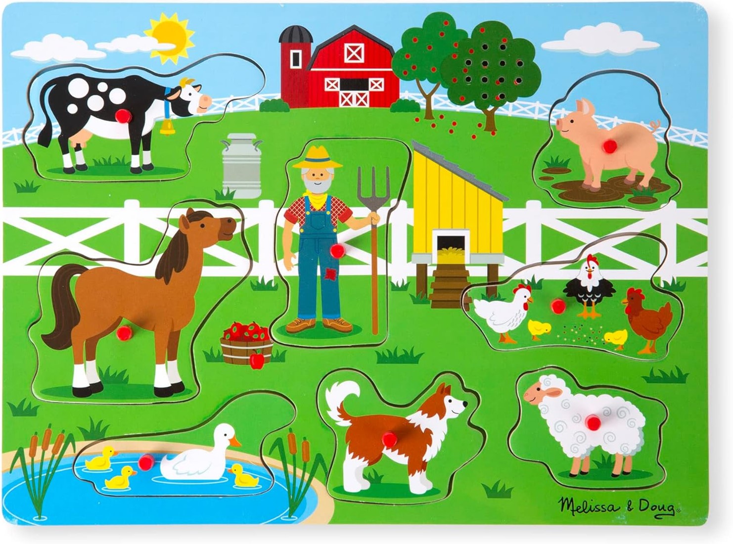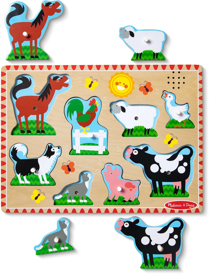 Laat boerderijdieren tot leven komen onder kleine kinderhandjes met deze interactieve geluidenpuzzel van Melissa & Doug. Elk puzzelstukje vertelt zijn eigen verhaal: zodra het juiste dier op de juiste plek wordt gelegd, klinkt een herkenbaar boerderijdierengeluid. Zo ontdekken jonge kinder op een vrolijke en verrassende manier de wereld van de boerderij – met hun oren, ogen én handen.