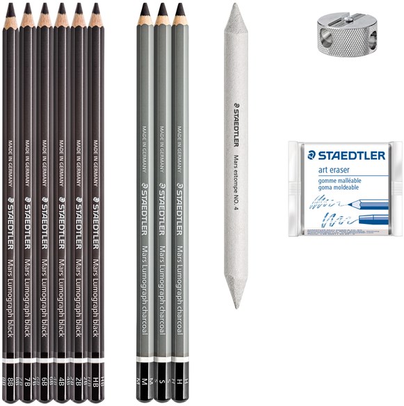 Ideaal voor expressieve schetsen en tekeningen evenals voor hobbydoeleinden Bevat een waaier aan hoogkwalitatieve producten Stap-voor-stap instructies en gedetailleerde beschrijving van de toepassingen op de rugzijde van de verpakking Set van 12 stuks Inhoud: 6 x Mars Lumograph charcoal 100C 3 x Mars Lumograph black 100B 1 x doezelaar 1 x kunstgom 1 x slijper