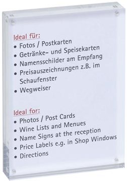 Uit hoogwaardig acryl Past prima in elke werkomgeving Voor menukaarten, foto's, tafelaanduidingen, folders, etc. Lange levensduur en hoge kwaliteit Horizontaal of verticaal te gebruiken Met magneetsluiting