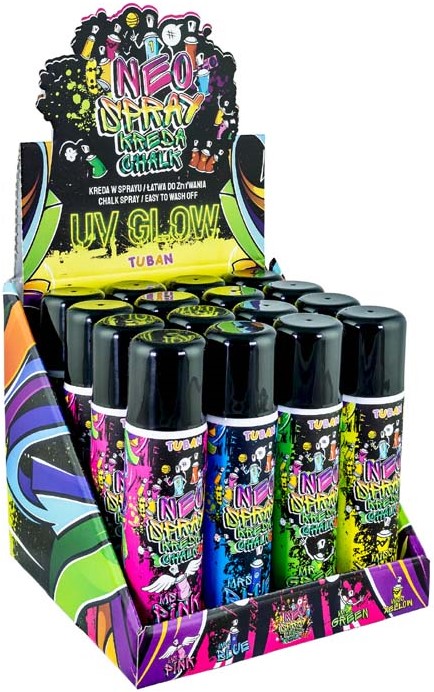 Neon krijt spray display 16*150 ml mix van kleurenspray krijt is perfect voor creativiteitsbediening en kan worden gebruikt op oppervlakken zoals glas, asfalt, hout of gras. Met zijn hulp kunt u kleurrijke kunstwerken creëren, en het kan gemakkelijk worden gewijzigd of verwijderd omdat het krijt gemakkelijk af te wassen is met bijvoorbeeld het gebruik van schoon water of weersomstandigheden (regen). Het wordt geleverd in 4 intense, neonkleuren (blauw, geel, groen en roze).100% gepolijst product