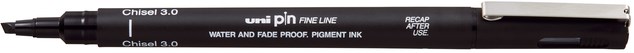 De Uni Pin fineliner met afgevlakte beutelpunt heeft een dikte van 3 mm en geeft duidelijke en strakke lijnen. De inkt is weerbestendig, waterbestending en oplosmiddelbestendig en vervaagt niet. Hierdoor blijven tekeningen lang bewaard. De pen beschikt over een regelmatige inkttoevoer en is ondermeer geschikt voor plattegronden, lichtdrukken en schetsen.
