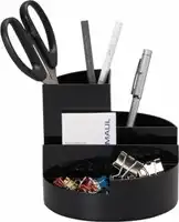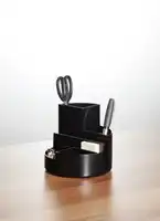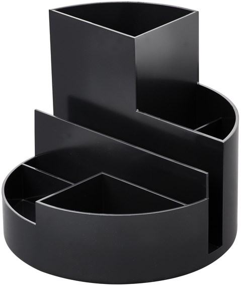 Kies je voor duurzame kantoorartikelen? Dan is deze bureauorganizer van 85% gerecycled kunststof een verantwoorde keuze. De pennenbak bestaat uit zes kokers in verschillende hoogtes en verschillende doorsnedes. In het midden van de ronde vorm is een dwars vak voor brieven of je notitieboekje. Het pennenbakje is natuurlijk ook te gebruiken als organiser in de keuken, magazijn of in de werkplaats.