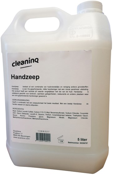 • De handzeep van Cleaninq in een handige 5 liter navulverpakking is ideaal voor drukbezochte locaties waar hygiëne en comfort hand in hand gaan. Deze fris geparfumeerde, vloeibare handreiniger heeft een milde werking en een luxe parelmoer uitstraling. Dankzij de huidneutrale pH-waarde is de zeep geschikt voor dagelijks gebruik zonder de huid uit te drogen. Perfect als navulling voor zeepdispensers in kantoren, openbare ruimten, restaurants en andere professionele omgevingen. Kenmerken: