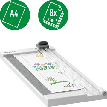 Lichtgewicht en compacte A4-rolsnijmachine, ideaal voor thuis en te gebruiken bij hobby toepassingen. Het mes is geheel omsloten en snijdt gemakkelijk tot 8 vel papier van 80 gram.