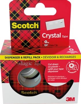 Scotch Crystal Tape plakband 19 mm x 7,5 m dispenser + 3 rolletjes ophangbaar doosje