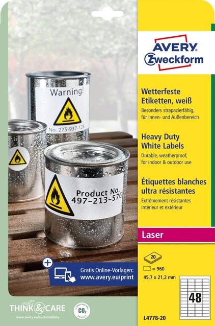 Stel een vraag over Etiket Avery L4778-20 45.7x21.2mm polyester wit 960 etiketten