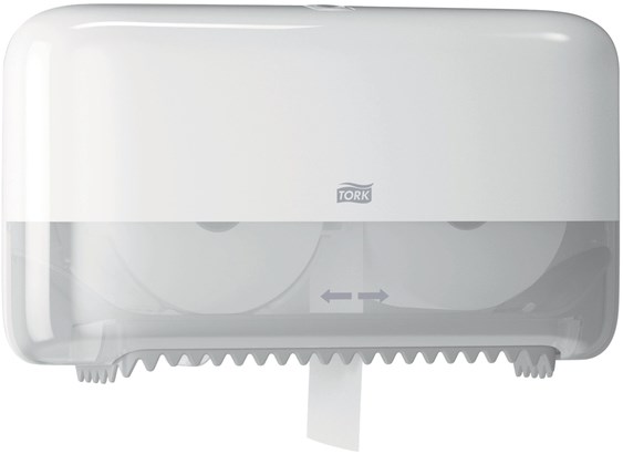 De Tork Twin Hulsloos Mid-size Toiletpapier Dispenser is ideaal voor sanitaire ruimtes met een hoog aantal gebruikers, waar de tevredenheid van de gast vooropstaat.
