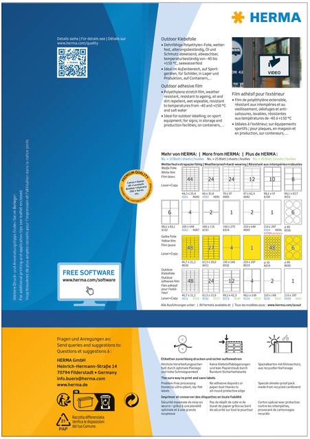• Weervaste etiketten van witte, matte polyethyleenfolie, zelfklevend op A4 vel.