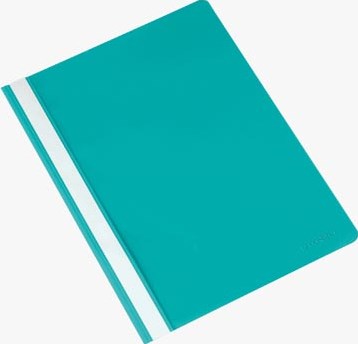 Uit PP. Achterkant gekleurd, voorkant transparant. Etiketvenster over de gehele lengte van de map.