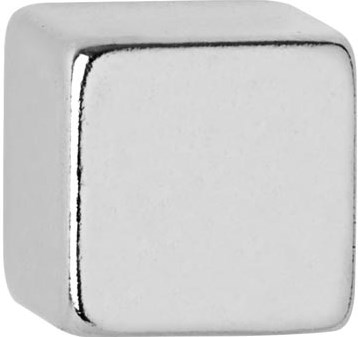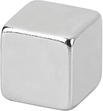 Esthetisch vormgegeven neodymium kubusmagneet, strakke vorm en glad stalen oppervlak, zilverkleurig, past zich decent aan de omgeving aan.