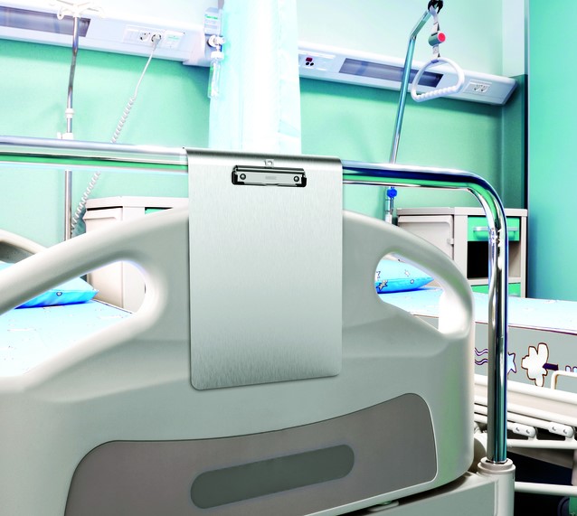 Stel een vraag over Klembord MAUL Medic A4 staand met boog aluminium met RVS klem
