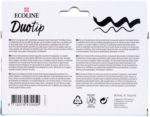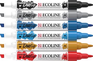 • Ecoline Duotip pennen bevatten geconcentreerde transparante waterverf, deze briljante kleuren in combinatie met de twee verschillende penpunten, een smallen kogelvormige en een bredere beitelvormige punt, geven je de vrijheid om fijne of brede lijnen te maken en in te kleuren.