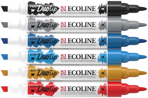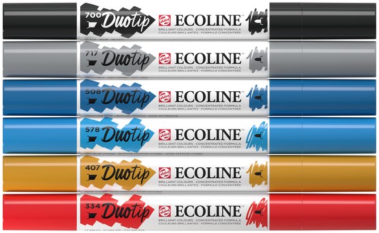 • De op kleurstof gebaseerde Duotips werken perfect in combinatie met de Ecoline Brush Pens en Ecoline flacons en bieden je een breed scala aan opties in lijndiktes, stijlen en kleurvariaties.
