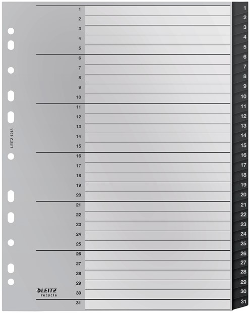 Stel een vraag over Tabblad Leitz Recycle A4 11-gaats 1-31 extra breed PP
