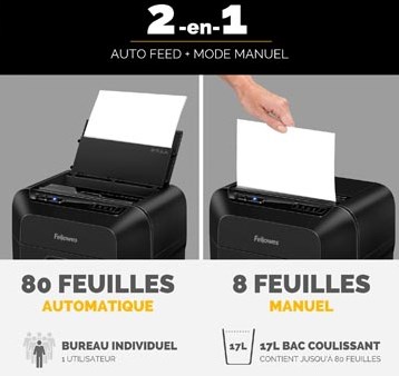 De papierversnipperaar van Fellowes is ideaal voor gebruik op je thuiswerkplek of het wat kleinere kantoor. Het unieke aan deze shredder is da je zowel handmatig als een automatische invoer hebt. Handmatig kun je tot 8 vellen tegelijk inveren, via de autofeed versnippert de papierversnipperaar 80 vel tegelijk in papiersnippers van 4 x 12mm. Dit is veiligheidsniveau P4 wat voldoet aan de wetgeving rondom privacy. Het is niet nodig voor het versnipperen de nietjes of paperclips te verwijderen want de scherpe messen versnipperen deze gewoon mee. Dat scheelt tijd en moeite!