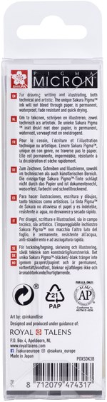 Deze Pigma Micron is de allereerste wegwerpbare technische pen die gebruik maakt van pigmentinkt van archiefkwaliteit. De inkt loopt niet uit, vloeit niet uit en drukt niet door op de meeste soorten papier.