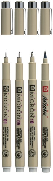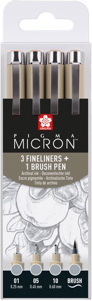 De selectie bestaat uit de volgende koelgrijze brushpennen, Pigma Micron 01 (0.25mm), Pigma Micron 05 (0.45mm), Pigma Micron 10 (0.60mm) en Pigma Brush.