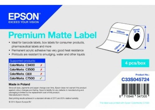 Premium matte inkjetlabels met coating voor hoogwaardige kleurenafdrukken met fotokwaliteit dankzij pigmentinkten. Het etiket is van premium kwaliteit en heeft een matte finish. Het zachte, helderwitte oppervlakte met een matte afwerking levert in combinatie met DURABrite Ultra-pigmentinkten sneldrogende afdrukken die krassen, water en hitte weerstaan. De universele, permanente acrylhechting levert probleemloze en goede hechting op een groot aantal oppervlakken, ook bij lage temperaturen. O.a. geschikt voor het maken van Post.nl verzendlabels, DPD labels en vele andere pakketdiensten op de Epson TM-C3500 kleurlabelprinter.