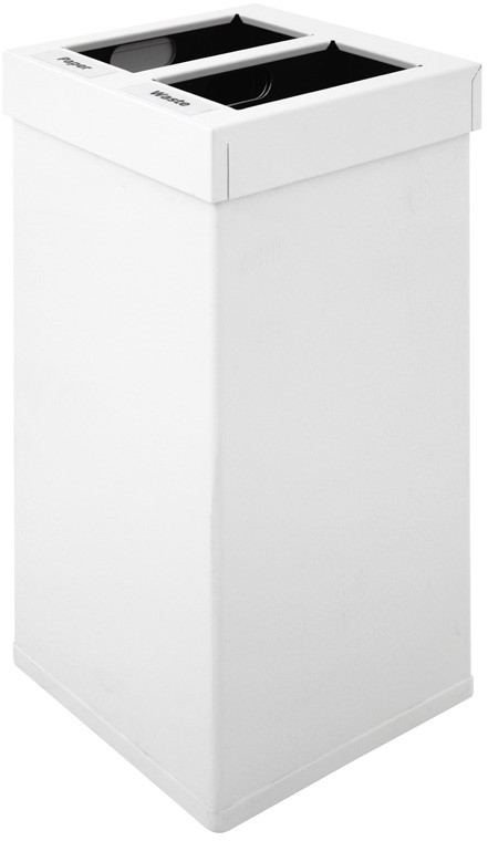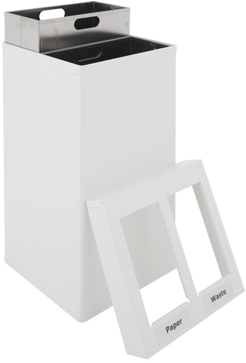 Deze design afvalbak van wit aluminium heeft 2 aluminium binnenbakken.- Kleur: Wit- Inhoud in liters: 2x52,5- Formaat: B 360 x L 360 x H 765mm- Inclusief (basis) stickerset afvalscheiding