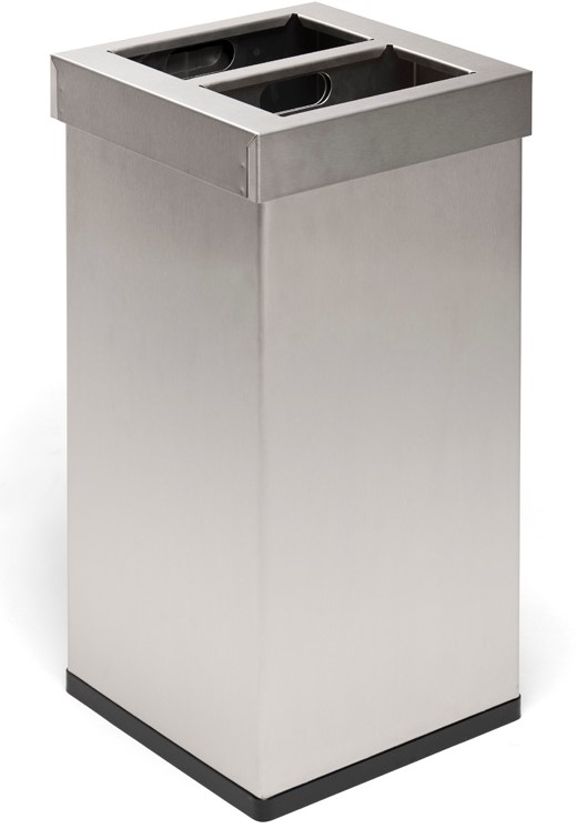Deze design afvalbak van RVS heeft 2 aluminium binnenbakken.- Kleur: RVS- Inhoud in liters: 2x52,5- Formaat: B 360 x L 360 x H 765mm- Inclusief (basis) stickerset afvalscheiding