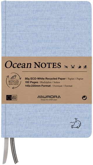 De linnen"" cover van de notebook Ocean Notes is gemaakt van gerecupereerde plastic uit de zee. Bovendien werd gekozen voor een wit gerecycleerd schrijfpapier. Op de blauwe kaft is het icoontje van een walvis terug te vinden. De Ocean Notes is meer dan een notebook, het is een symbool van posittieve verandering, doe je mee?""