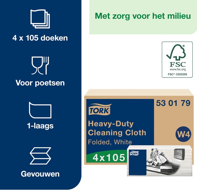 Specificaties Reinigingsdoek Tork W4 Premium Heavy-Duty gevouwen 1-laags 4x105 vel wit 530179