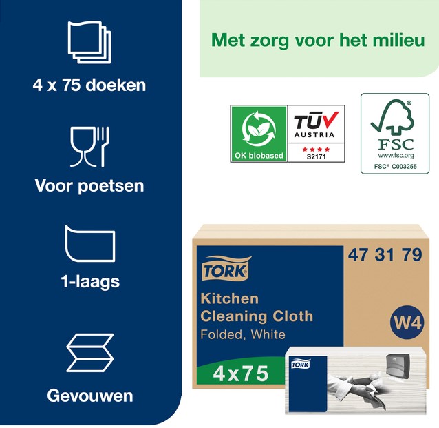 Stel een vraag over Reinigingsdoek Tork W4 Premium gevouwen 1-laags 4x75 vel wit 473179