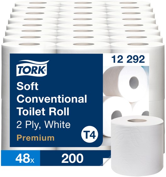 Te gebruiken met onze Tork T4-toiletpapierdispenser met ruimte voor twee rollen om de vultijd te verkorten.