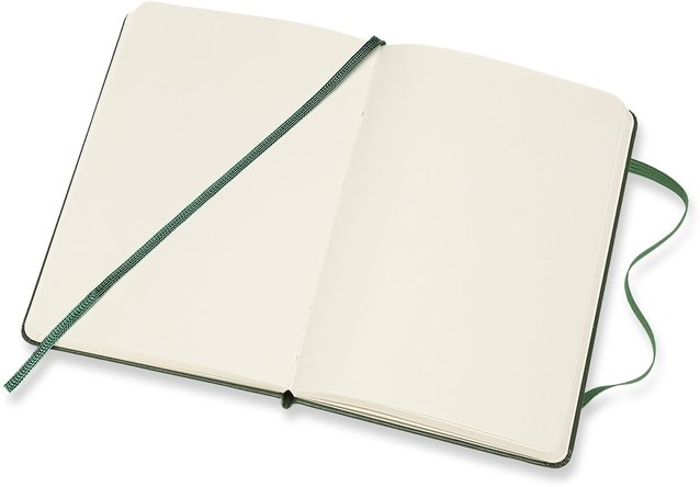 Kenmerken: afgeronde hoeken, elastische sluiting, ivoorkleurig Moleskine-papier, bijpassend leeslint, papier: 70 gsm, zuurvrij, “In geval van verlies”-label op het schutblad, uitbreidbaar binnenvak op achterkaft.