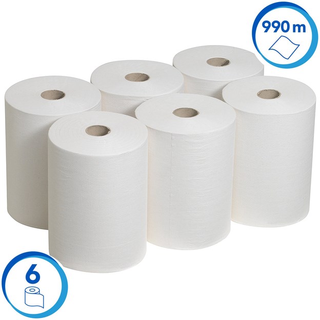 Geschikt voor Aquarius™ Slimroll™ Handdoek Dispensers (productcodes 6953 en 6969) en Kimberly-Clark Professional™ Slimroll™ gerolde handdoek Dispenser (productcode 9960). 6 x 165 m witte, 1-laags rollen (990 m in totaal)