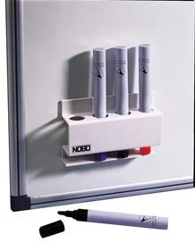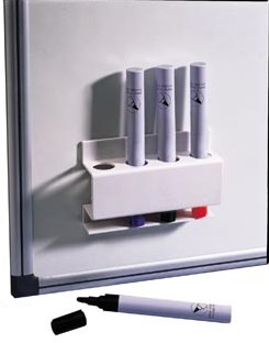 Markers worden veilig bevestigd op het whiteboardoppervlak met de magnetische pennenhouder.