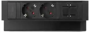 • Filex Desk up 2.0 opbouwunit 2x 230V + 1x CAT6 zwart. Deze fraaie zwarte ranke opbouwunit is standaard uitgerust met 2 klemmen voor bladdiktes van 15-45mm. De unit is eenvoudig van bovenaf te klemmen en is voorzien van een vast aansluitsnoer aan achterzijde met een lengte van 40cm met 3-polige connector  stekker. De opbouwunit is uitgerust met 2 x 230V aansluiting en een 1x CAT6.