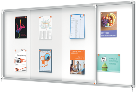 Vitrine met veiligheidsglas (4 mm). Voor binnen. Omlijsting van geanodiseerd aluminium. Schuifdeur. Metalen achterwand voor gebruik met magneten en/of whiteboardmarkers. Levering inclusief slot met 2 sleutels. Inclusief muurbevestigingsmateriaal.