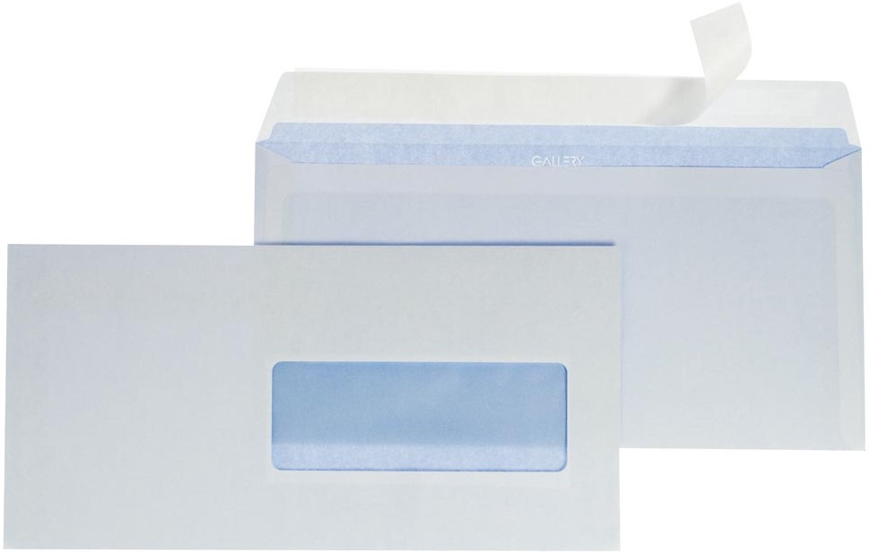 Artikelomschrijving Gallery enveloppen ft 114 x 229 mm, met venster rechts, stripsluiting, pak van 50 stuks