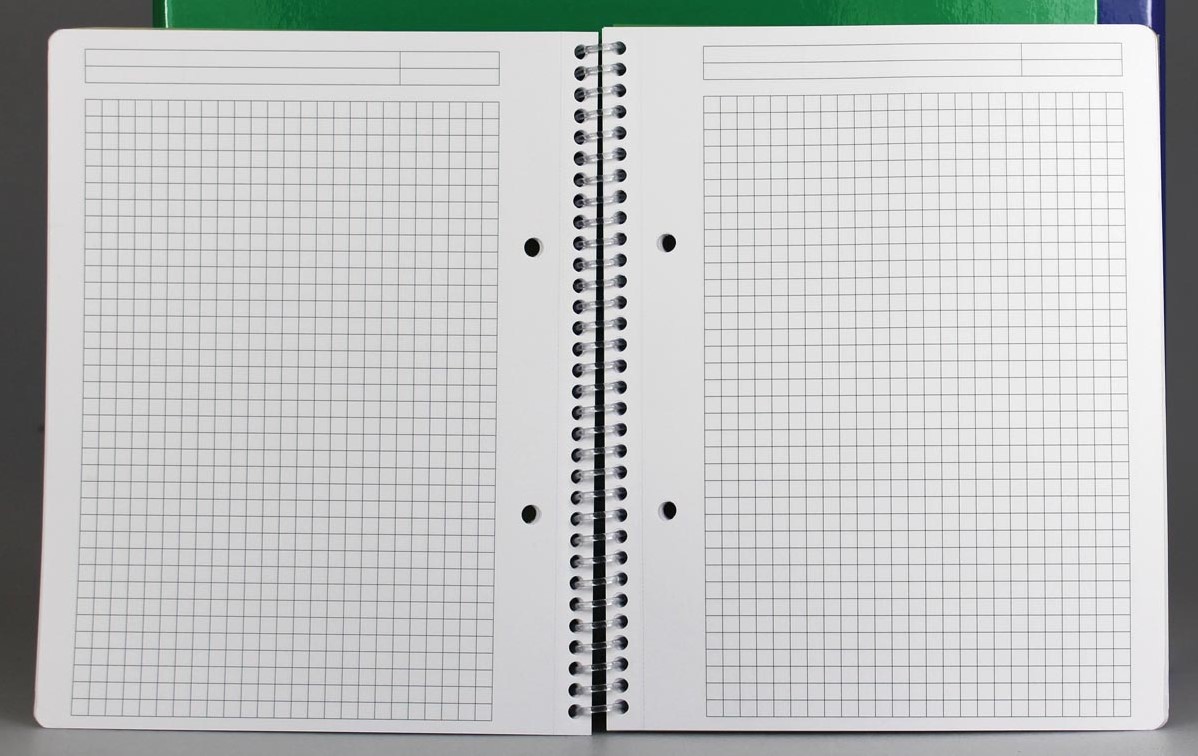 Papier van 80 g/m². 160 bladzijden (80 vel). Met microperforatie. Kaft uit transparante PP, spiraalbinding uit kunststof. Geassorteerde Traditional kleuren: geel, groen, blauw, rood en grijs.