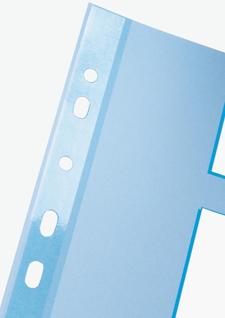 Tabblad in heldere kleurencombinaties. Voor ft A4. Uit 160 g/m² karton. Speciaal geperforeerd blad met 21 perforatiegaten voor 2-, 4- en 23-rings mechanieken. Gemaakt van gerecycled karton. Blue Angel gecertificeerd materiaal. Voorblad biedt grote ruimte voor beschrijving van de inhoud. Versterkte perforatiestrip op voorblad