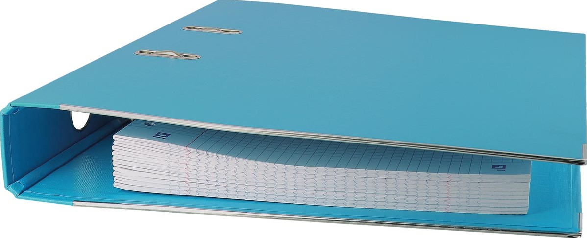 Voor ft A4. Vervaardigd uit extra stevig karton, binnen- en buitenzijde met PP overtrokken. Met exact sluitende hefboommechaniek en neerhouder, randbescherming, grijpgat, radosleuven en insteekrugetiket. Vuil- en vochtwerend.