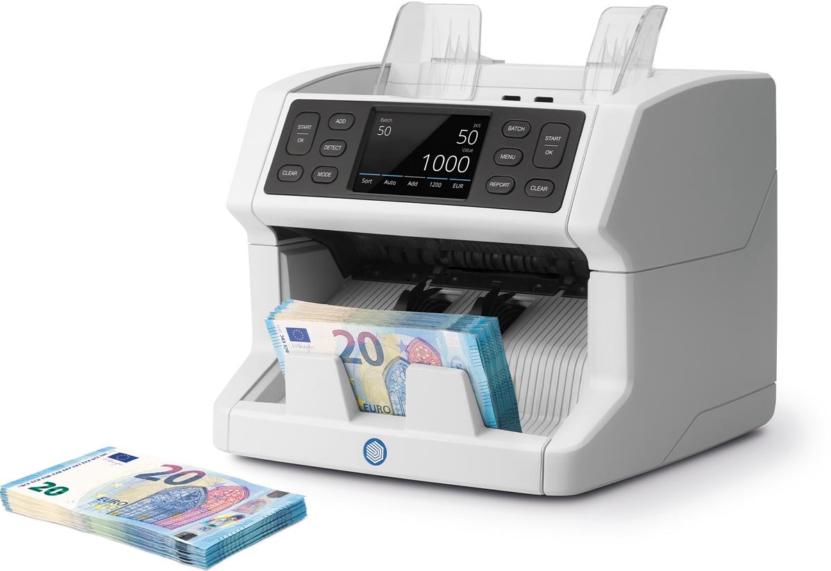 Telt grote hoeveelheden bankbiljetten met volledige zekerheid en gemak. De Safescan 2850 telt snel gesorteerde bankbiljetten en verifieert deze tegelijkertijd op basis van drie echtheidskenmerken. Ideaal wanneer u snel grote stapels bankbiljetten moet verwerken. Dankzij het slimme ontwerp, het high definition touchscreen en de intelligente interface in uw lokale taal, gaat het tellen van geld eenvoudiger, sneller en nauwkeuriger dan ooit. Telt aantal gesorteerde biljetten voor alle valuta's Telt tot wel1.200 bankbiljetten per minuut Verifieert bankbiljetten op basis van drie echtheidskenmerken Maakt stapels van gelijke hoeveelheden bankbiljetten met de batch-functie Eenvoudig te bedienen dankzij het high definition touchscreen met een meertalige interface en quick menu Stopt met tellen en geeft een hoorbaar en zichtbaar alarm als er een verdacht bankbiljet wordt gedetecteerd Helpt een lange levensduur te garanderen door onderhoudsmeldingen weer te geven wanneer het apparaat moet worden schoongemaakt