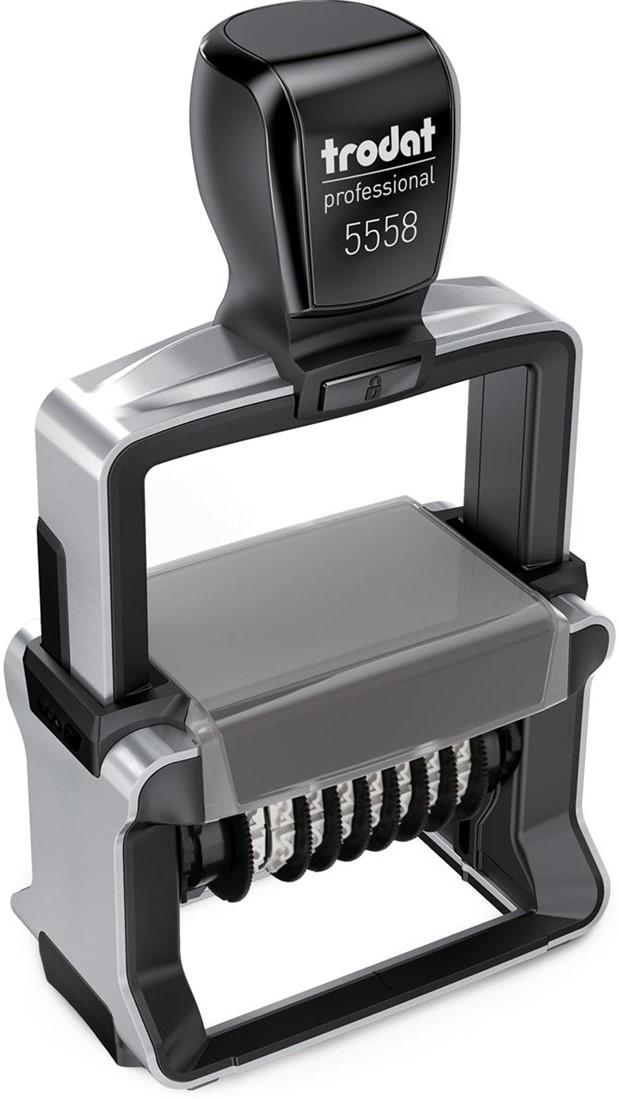 Trodat Professional 4.0 - het optimale teamlid voor de professionals op kantoor, in de produktie of logistiek. 5558 Trodat Professional 4.0 - cijferbandstempel. Schrifthoogte cijfers: 5 mm. Symbolen bijv.: ?, $, #, Kg, /, X. Uit metaal. Met ingebouwd inktkussen. Certificaat: Austrian Ecolabel Gerecycleerd materiaal: 7,46 %