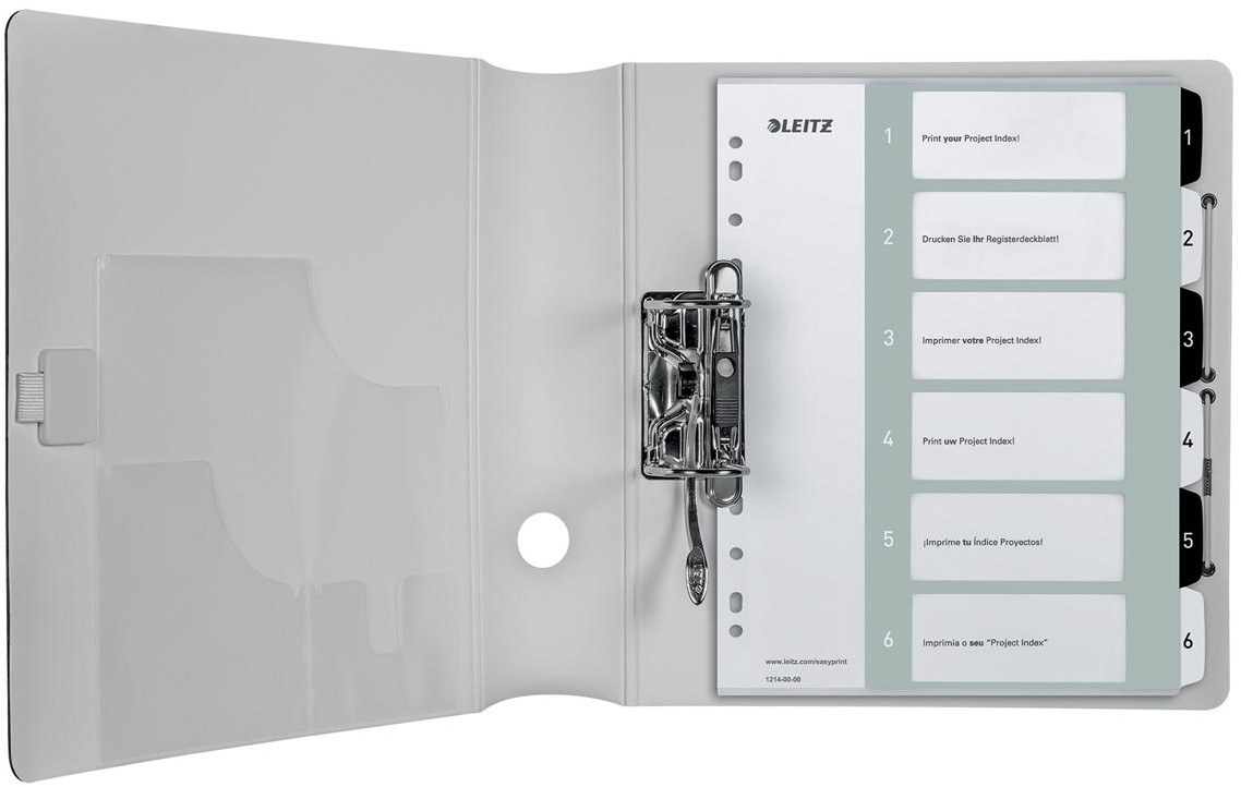 PC printbare index via www.leitz.com/easyprint. Sterk en duurzaam met heavy duty PP van 300 micron. A4+ formaat (30,5 x 24,5 cm) zorgt voor snelle toegang zelfs bij gebruik van showtassen. 11-gaatsperforatie.